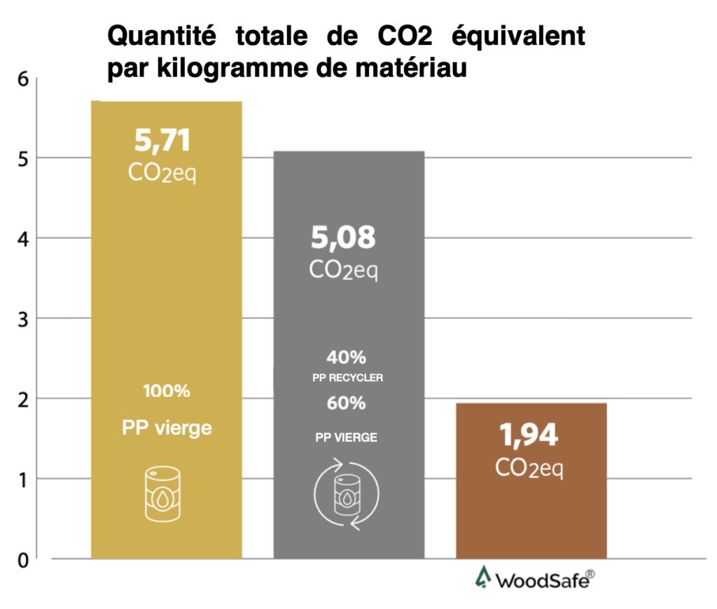 WoodSafe se démarque par un cycle de vie unique. En effet, dès le sourcing des matières premières, cette solution réalise une prouesse en utilisant 80% de plastique en moins. A la place, on retrouvera de la sciure, un déchet revalorisé de l’industrie forestière suédoise et du biopropylène issu de résine de pins, une matière première renouvelable et régénérative. Partis du constat que les matières premières revalorisées et régénératives étaient plus pertinentes que l’utilisation de matières fossiles destinées à l’incinération, WoodSafe a développé une première version, WoodSafe100 composée 50% de sciure et 50% de biopropylène de résine de pin. Toutefois, devant les coûts importants de ce dernier, une version temporaire, WoodSafe80, qui réduit la part de ces matières premières à 40% chacune et qui incorpore 20% de plastique issue de matière fossiles. A terme, cette version WoodSafe80 est vouée à disparaître, au profit de la solution WoodSafe100 dès lors que nous pourrons la proposer aux établissements à un tarif plus abordable. Cependant, il est à noter que même sur cette version, les économies sur l’empreinte carbone sont gigantesques : jusqu’à 66% d’Equivalent CO2 sur l’ensemble du cycle de vie.