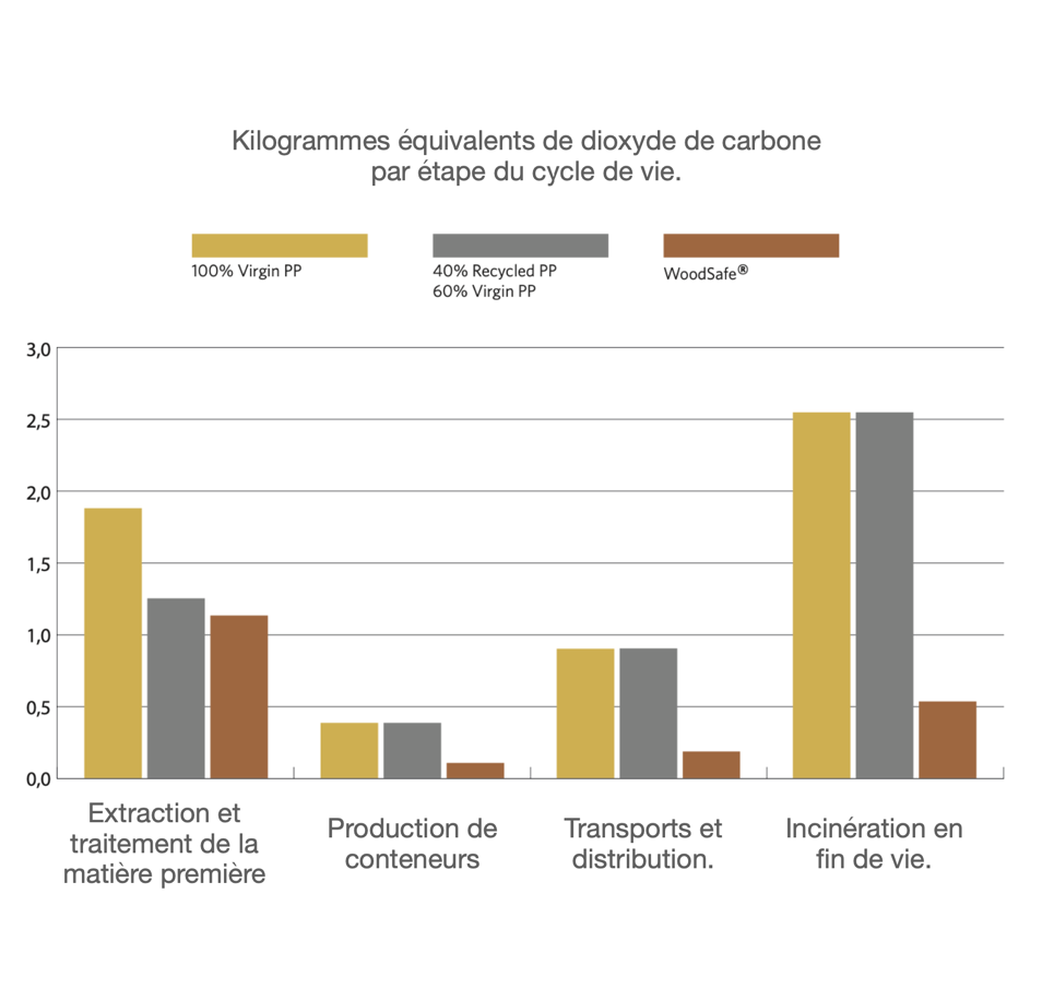 WoodSafe80 est un contenant en biocomposite fabriqué en Suède. Sa composition unique associe 40% de sciure de bois, un matériau revalorisé car il s’agit d’un déchet des scieries, 40% de biopropylène synthétisé à partir de résine de pin et 20% de propylène plastique. Les propriétés de ce contenant sont les mêmes que les contenants en plastique : résistance, étanchéité etc. Cependant, de sa fabrication à son incinération, son cycle de vie représente un impact bien moindre sur l’environnement.